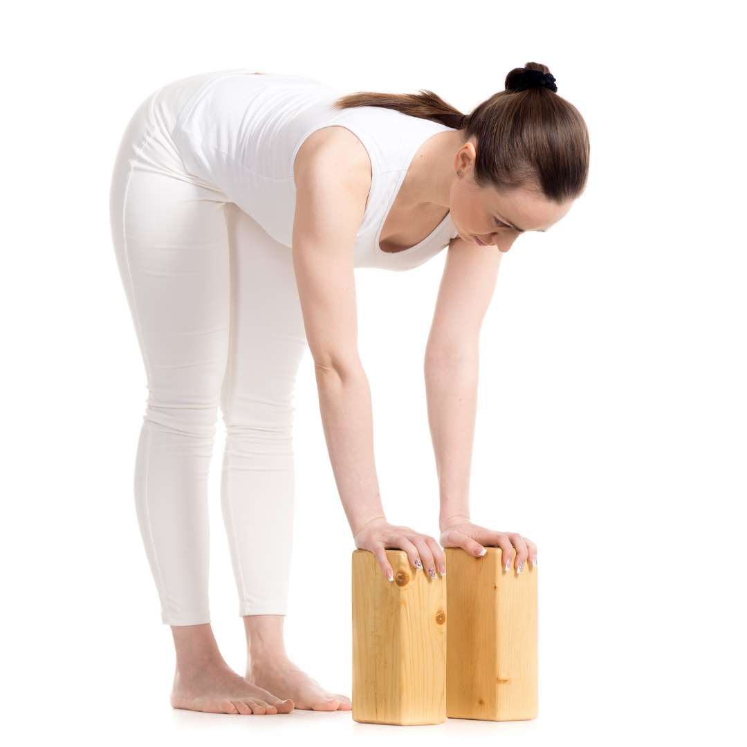Now to move the focus of this stretch further down between your shoulder blades, let your arms drop straight down toward the floor as you slowly bend forward at the waist. Keep squeezing your abs to protect your lower back and let your shoulders sink further forward to feel the full effect of the stretch.